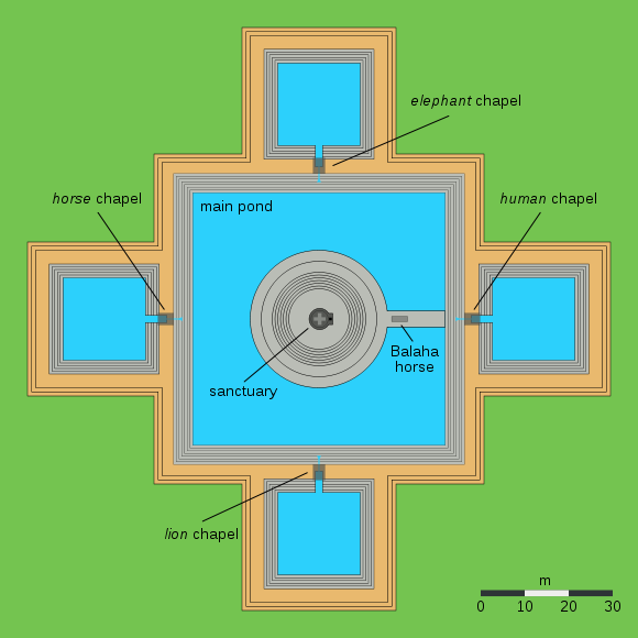 Notice: However this is the most known interpretation of this place, there are more researches that explain things differently, for example, the artificial island represents the lake Anavatapta, the homeland of the Gods in the Himalayas, the Balaha horse is a flying horse rescuing the trader Simhala. For sure there are many things to investigate until someone can come upon certain results. There is a mix of Hinduism and Buddhism that in my opinion was the start of the end of this great civilization by the meaning that a great civilisation must stay and insist on its original beliefs in order to maintain its greatness.